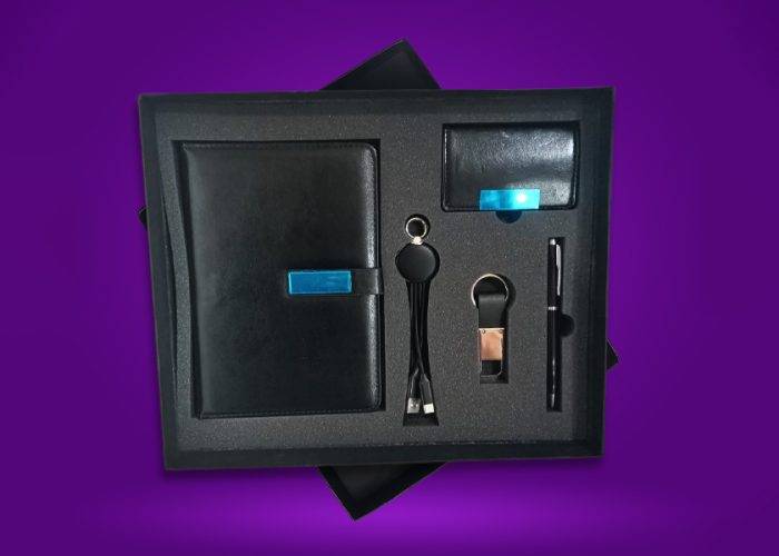 BO-33 | بوكس نوت بوك + قلم + وصلة مضيئة + ميدالية + كراتة – هدية عملية بشكل عصري